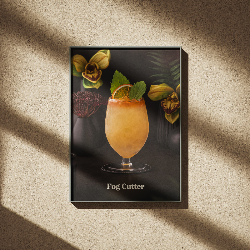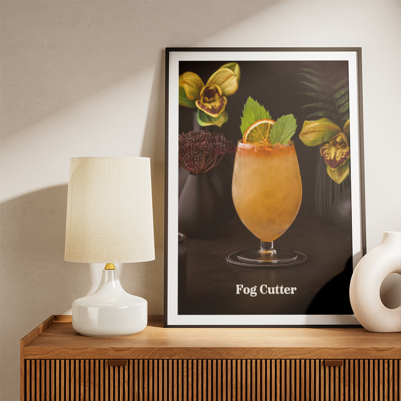 The Fog Cutter cocktail – a legendary mix of rum, gin, brandy, citrus, and orgeat – is known for its complex flavor profile and smooth yet intense character. This artwork captures the essence of this classic drink, making it a perfect statement piece for cocktail lovers and modern interiors alike.