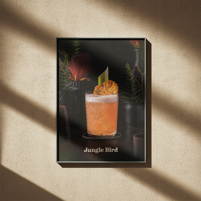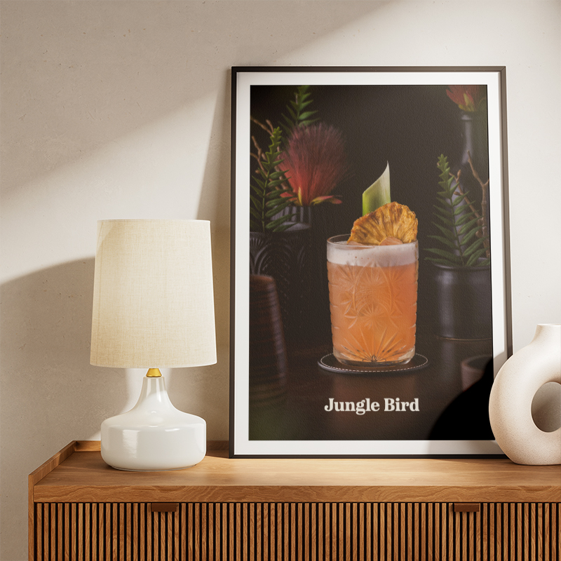 The Jungle Bird cocktail – a unique blend of dark rum, pineapple, Campari, and lime – is known for its perfect balance of sweet, bitter, and tropical flavors. This artwork captures that distinctive character, making it a standout piece for cocktail lovers and design enthusiasts alike.